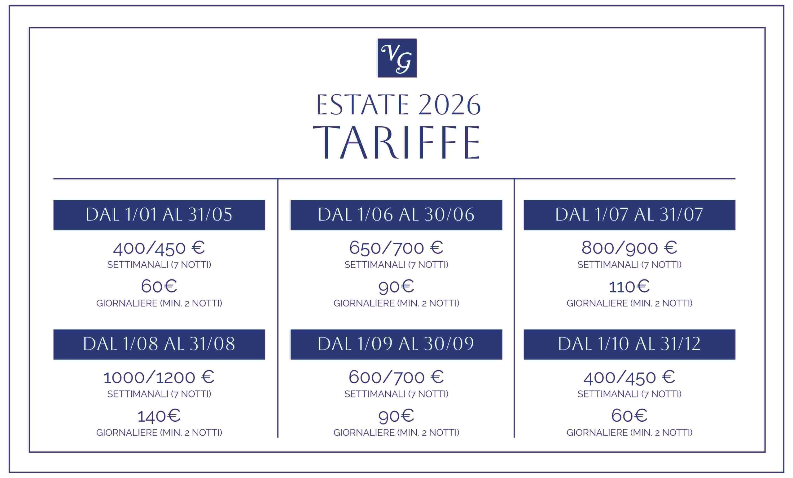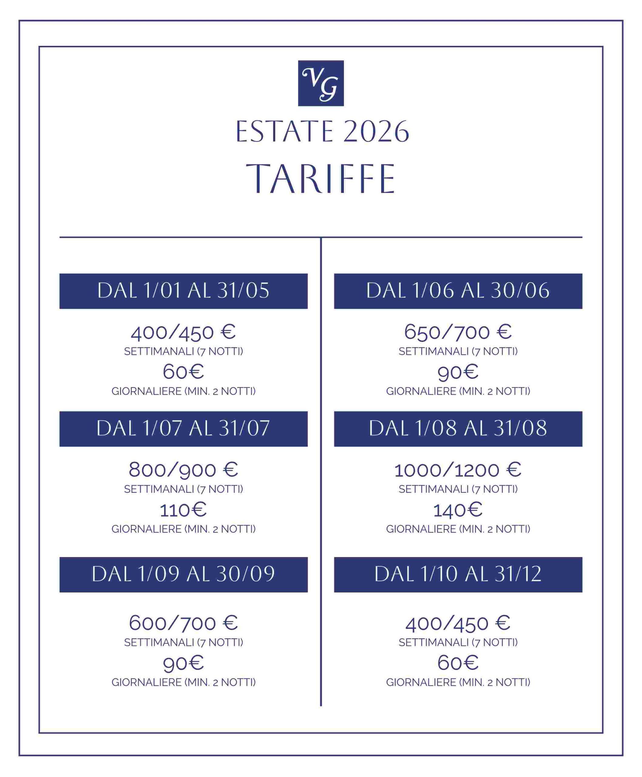 Quote Minimo/Massimo in base al periodo e agli occupanti – Pulizie finali 30€ – Deposito cauzionale 150€
